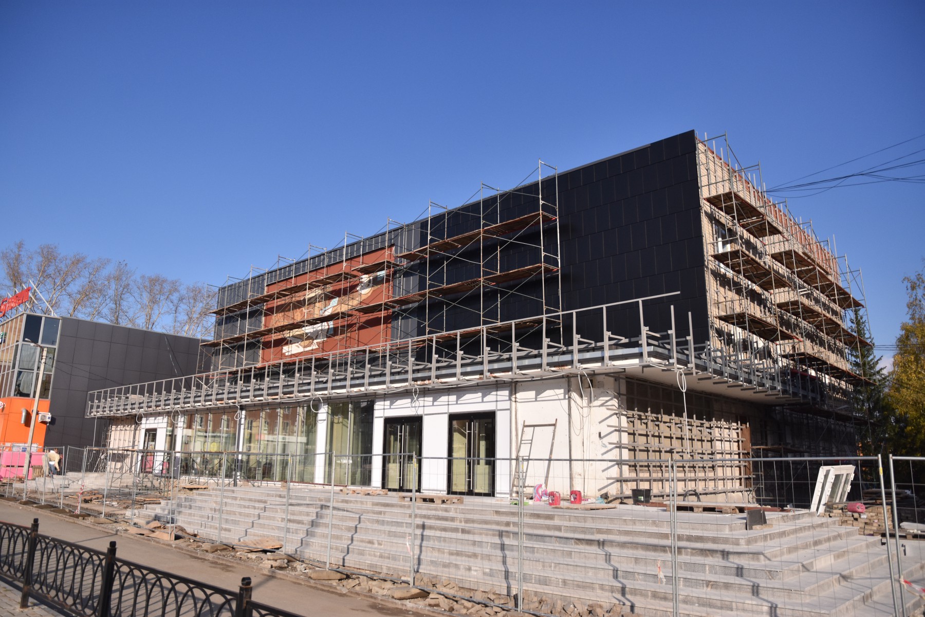 Тем временем активно идут работы по благоустройству фасада КДЦ «Победа». Рабочие приступили к закрытия панелями правого торца. На входе заменили двери и витражи — они стали более обзорные. Подготовлен новенький ввод холодного водоснабжения (старый был очень плох). Почти закончены лестницы. Сзади «Победы» уже начали благоустраивать территорию и ротонду. Там все будет в плитке, лестницы тоже сделают новые, фасад ротонды также обновят. Завершить работы по ремонту «Победы» планируют до 31 октября 2025 года.