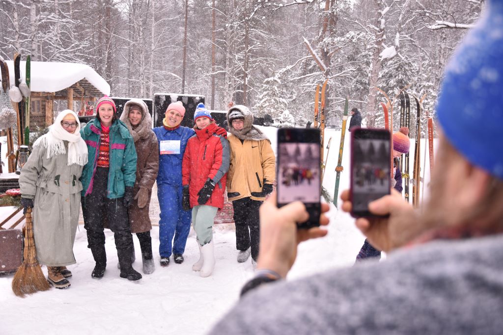 На стартовой поляне участники получали нагрудные номера. Здесь же разливали горячий чай и угощали печеньками. Рядышком горел большой костер, некоторые грелись у него. Победный пьедестал водрузили на сугроб, оформив все коврами, старыми лыжами, гармошкой и другими узнаваемыми атрибутами советского времени. Вся эта непередаваемая атмосфера заливалась музыкой того времени, пионерскими песнями, композициями из старых фильмов, которые звучали из раритетных колокольных динамиков. Пара таких вообще висела на елке.