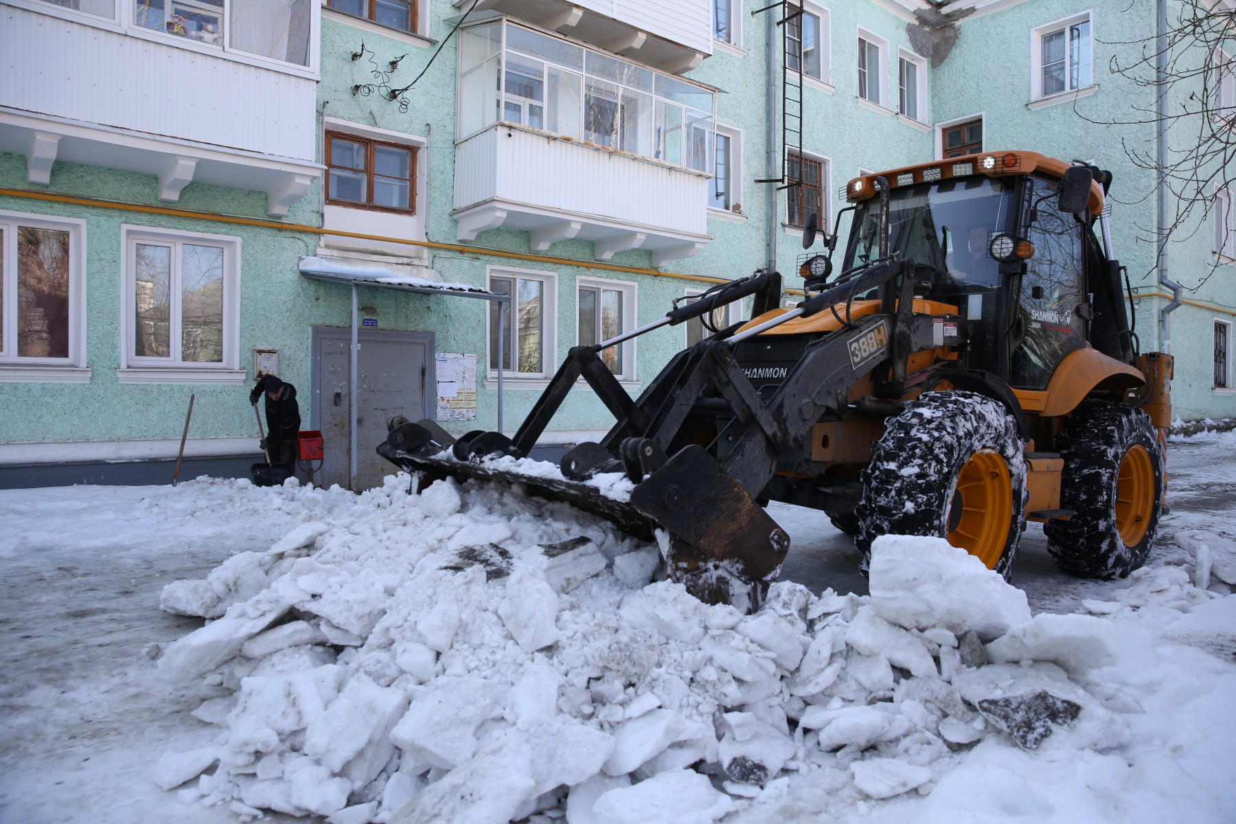 Сейчас в первую очередь снег мы убираем со скатных крыш и на плоских там, где есть протечки. По дворам решение, где убирать в первую очередь, принимает начальник участка — он работает на земле и видит, где ситуация хуже всего.